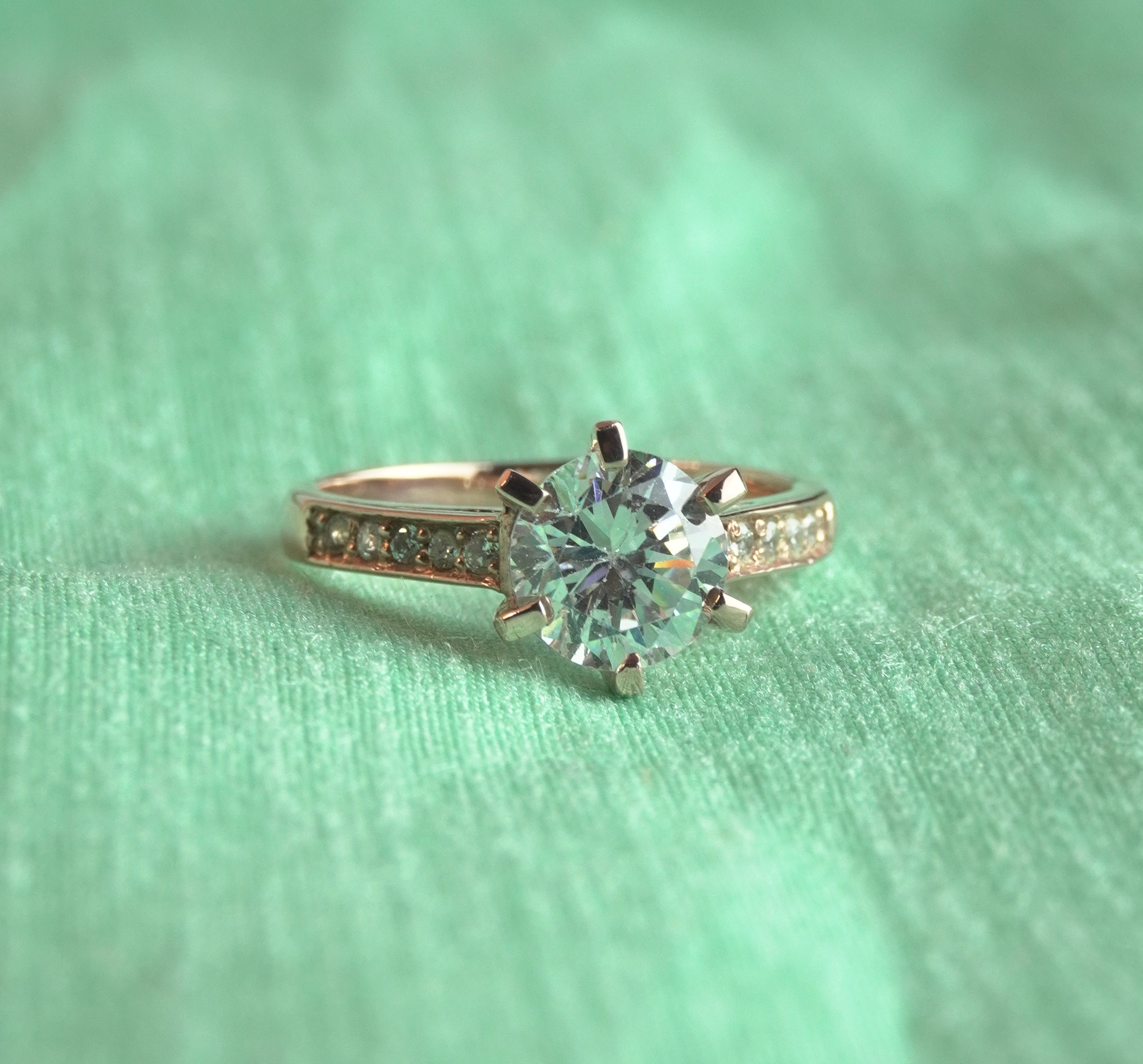 Capture the light with the Aurora Solitaire Ring, a stunning piece that perfectly blends classic elegance with a modern, warm finish. This ring features a brilliant round-cut center stone held securely by a striking six-prong setting, maximizing its sparkle and visibility. The band is further adorned with shimmering pavé-set accent stones lining both shoulders, creating a continuous flow of brilliance.
