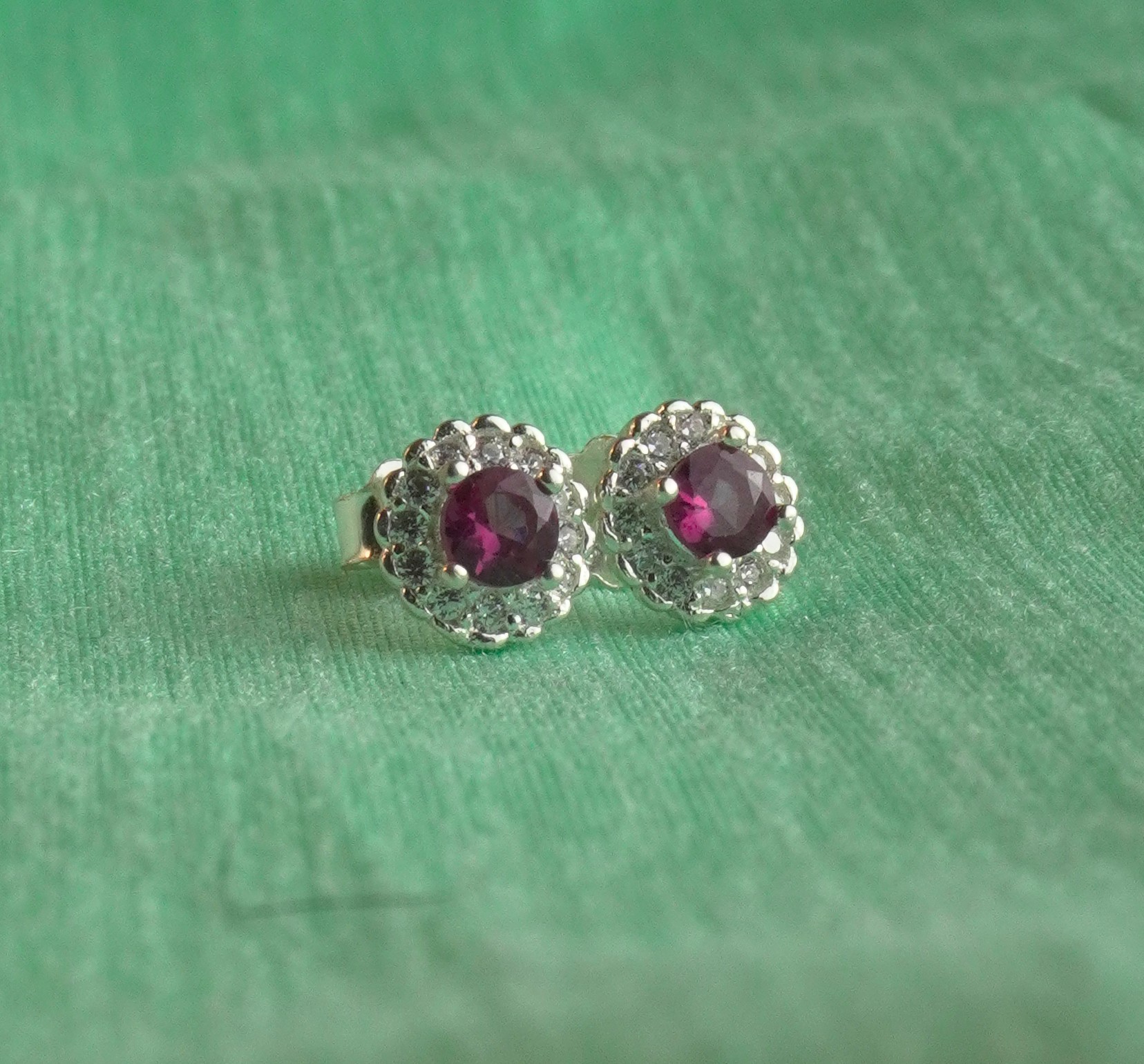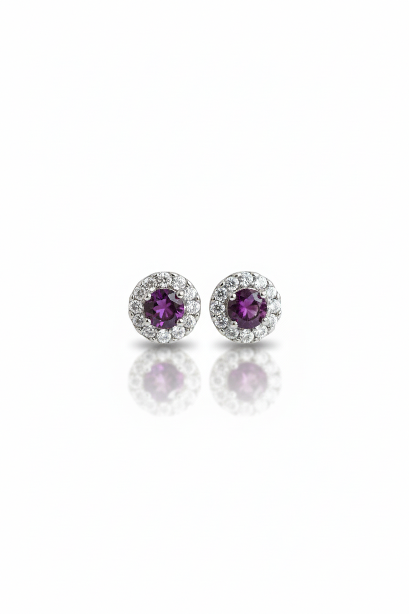 Introduce a touch of timeless elegance and vibrant color to your collection with the Regal Halo Stud Earrings. These classic studs feature a captivating oval-cut deep purple Garnet at the center of each earring, renowned for its rich, saturated hue that evokes royalty and sophistication. The Garnet is surrounded by a sparkling halo of brilliant-cut cubic zirconia accent stones, maximizing the overall brilliance and giving the sophisticated look of fine diamond jewelry.