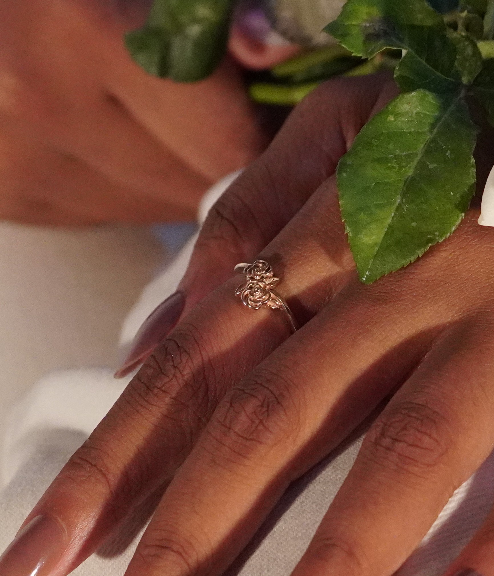 The Twin Rosebud Ring is a charming addition to any jewelry collection, offering understated elegance with a touch of botanical romance.